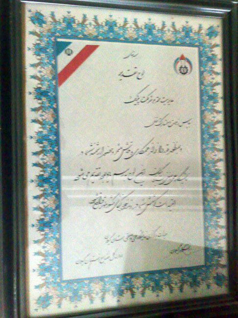 لوح تقدير واحد كيفي برتر از طرف استاندار و مدير كل استاندار گيلان |