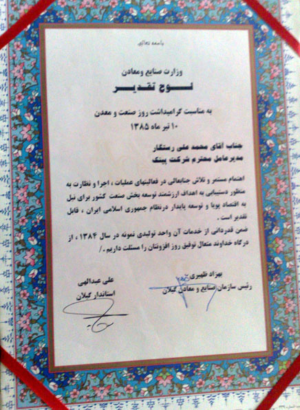 | لوح تقدير واحد صنعتي نمونه در سال 85 از طرف سازمان صنايع و معادن گيلان |